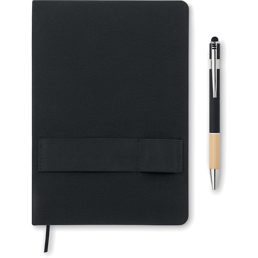 Coffret avec carnet et stylet tactile. Ce carnet est doté d'une couverture écologique en rPET et de 80 pages lignées en papier recyclé. Une pochette est présente au dos de la couverture. Le stylet est en aluminium avec des détails en bambou.