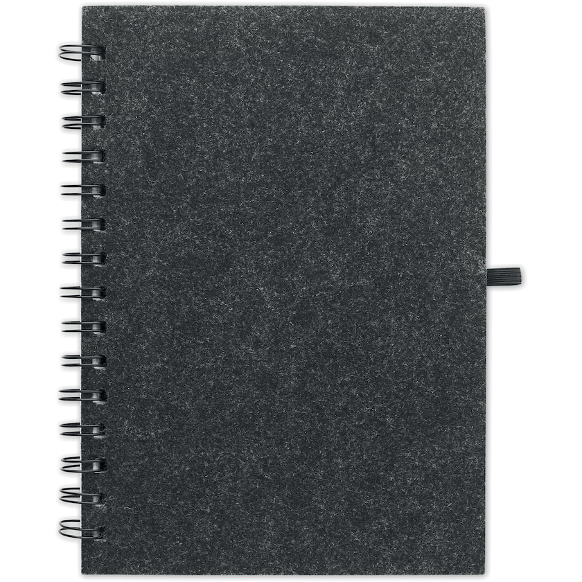 Livre à spirales écologique avec couverture en feutre. La couverture est fabriquée à partir de rPET, c'est-à-dire de bouteilles PET recyclées, et l'intérieur est fabriqué à partir de papier recyclé. Un symbole au dos de la couverture indique qu'elle est fabriquée à partir de matériaux recyclés.