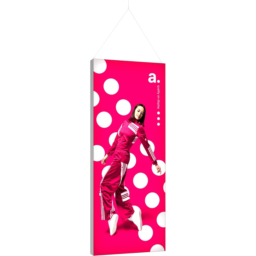 Immense caisson lumineux que l'on accroche au plafond. Parfait pour vos salons! La boîte lumineuse est équipée d'un système de lumières LED de pointe qui éclaire l'ensemble du motif sur les côtés. Votre motif est imprimé sur un tissu en polyester selon une méthode d'impression spéciale qui fournit des détails nets et des couleurs claires. Le motif est placé des deux côtés du caisson lumineux. Si vous souhaitez renouveler le motif à l'avenir, commandez simplement un nouveau tissu chez nous.