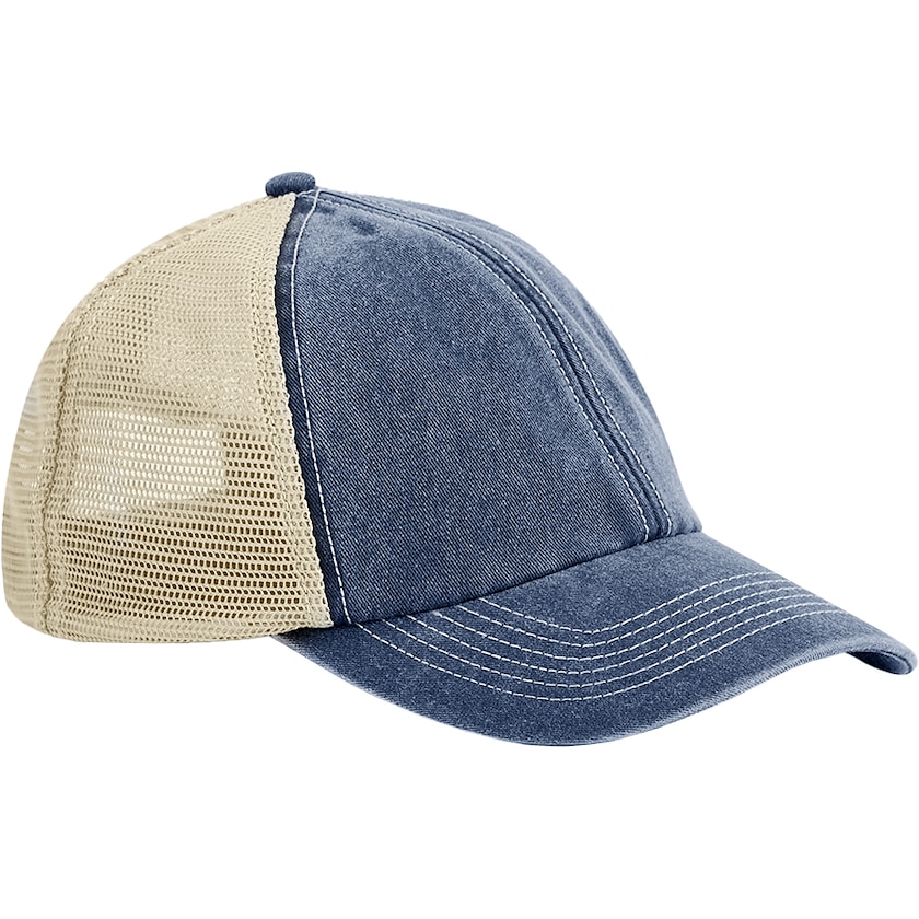 Casquette de camionneur écologique avec une touche vintage. La maille de la casquette est en polyester recyclé. L'avant est en coton robuste.