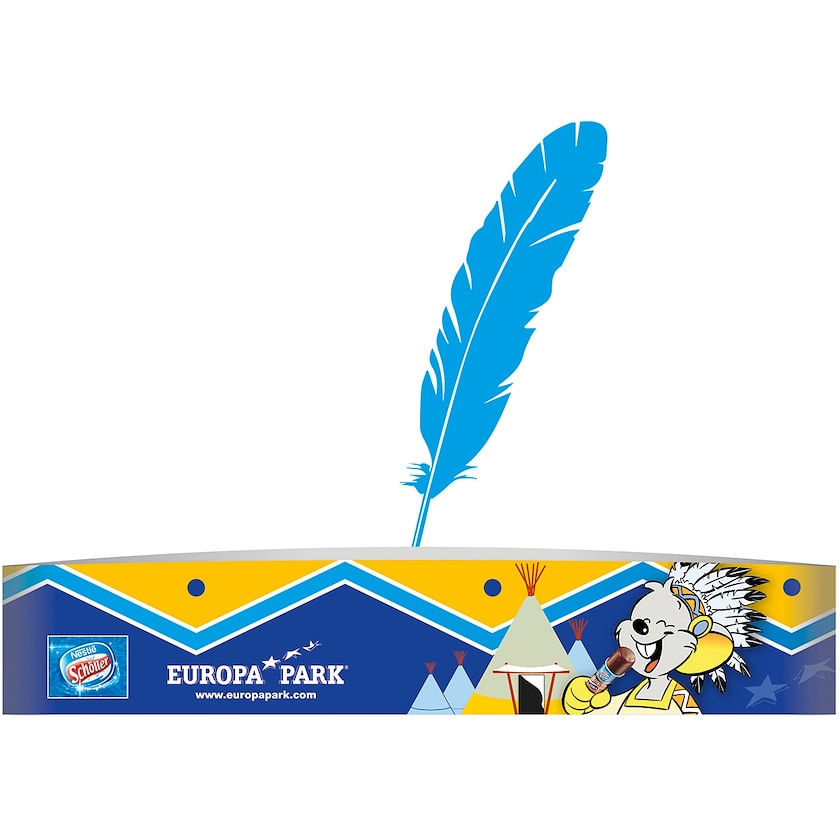 Bandeau d'Indien en carton recyclé. Le carton est composé à 95% de matériau recyclé. L'intérieur est blanc et l'extérieur est personnalisé entièrement suivant vos souhaits. Livré plié avec de vraies plumes de couleur vive.