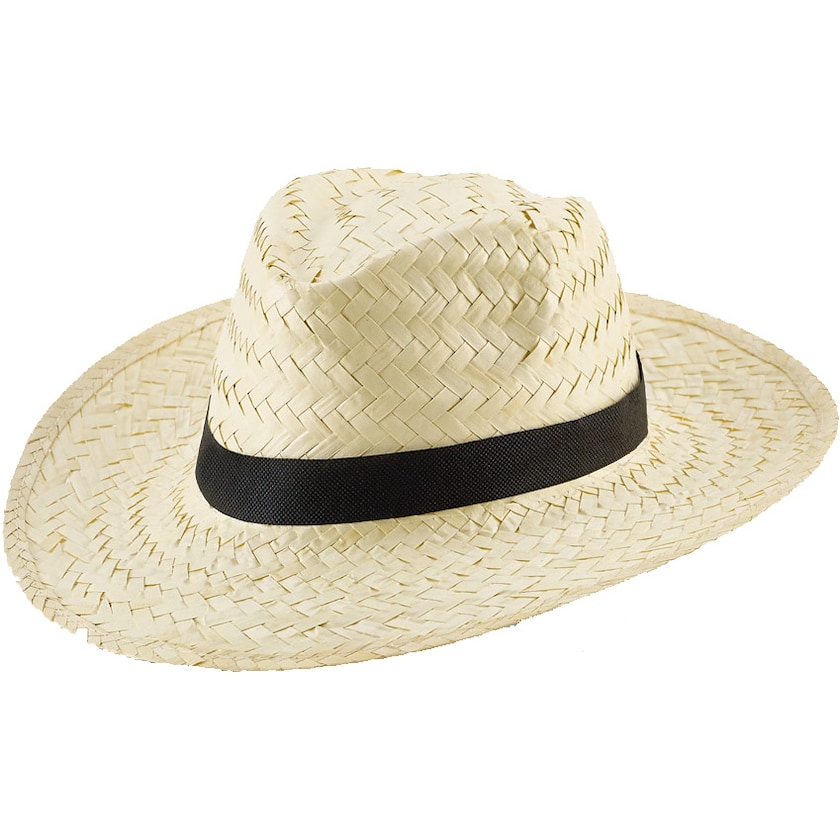Chapeau de paille véritable avec bande personnalisée. Choisissez entre une bande blanche ou noire. Le bandeau est en polyester.