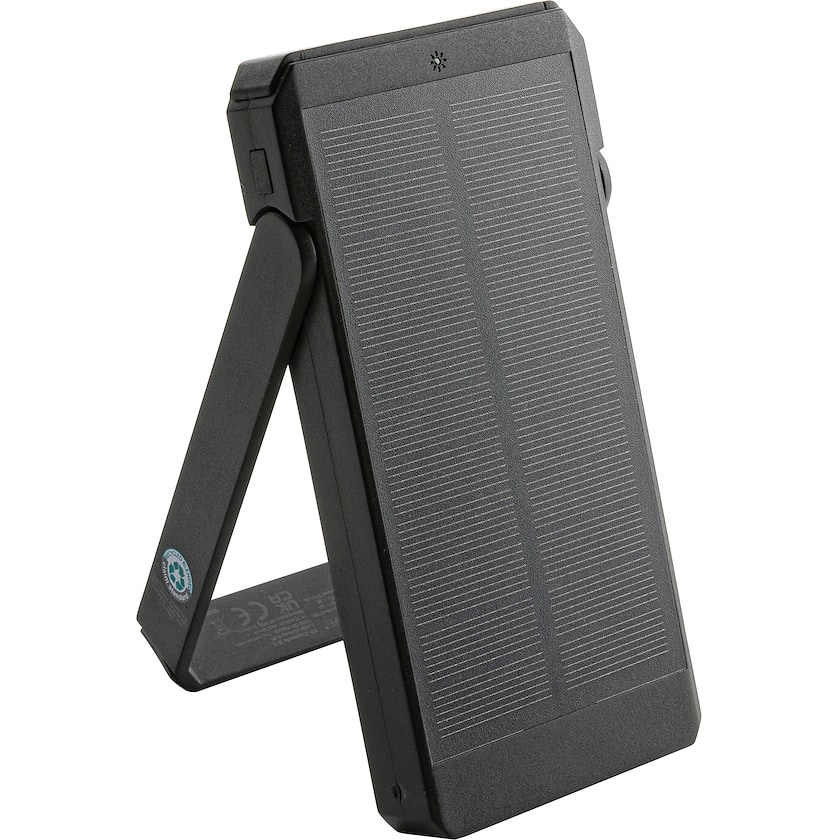 Banque d'énergie écologique avec chargement solaire. Bluford est fabriqué à partir d'ABS recyclé certifié RCS et ne contient aucun PVC. Livré dans une boîte cadeau en papier certifié FSC. Modèle déposé®.