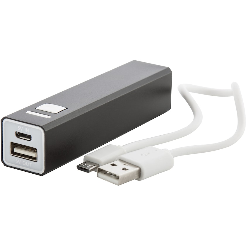 Batterie externe économique en aluminium. Câble micro usb inclus. La personnalisation est effectuée soit par impression soit par gravure laser. L'impression est effectuée en 2 couleurs maximum.