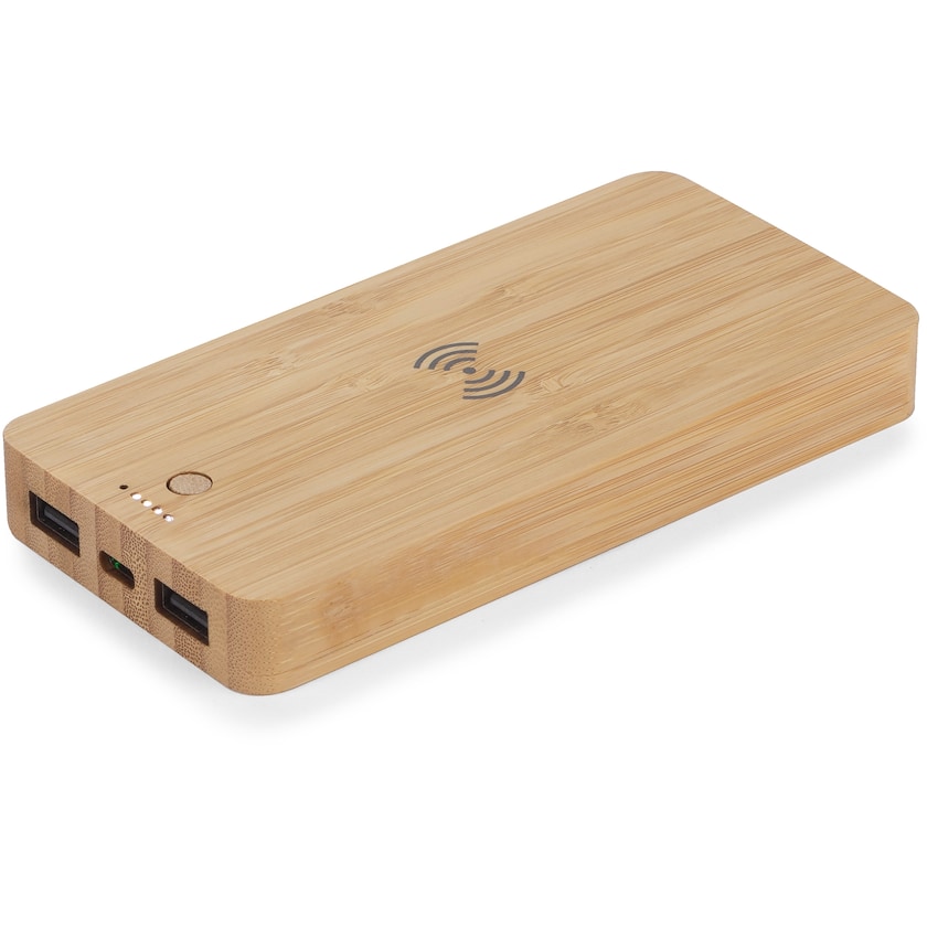 Banque d'alimentation en bambou avec chargement sans fil. Choisissez entre l'impression ou la gravure au laser. Livré dans une boîte en carton de couleur naturelle.