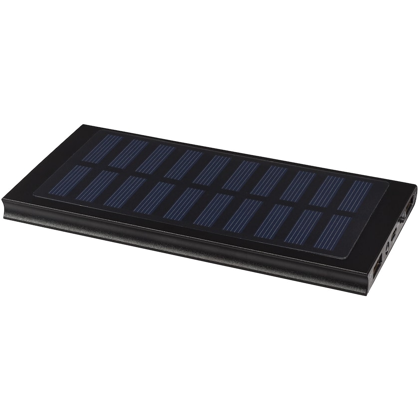 Batterie externe solaire avec lampe LED intégrée. La batterie externe est équipée d'une batterie au lithium-polymère et d'un panneau solaire en crystal. La lampe Led s'allume en appuyant deux fois sur l'interrupteur. Câble micro-USB inclus.