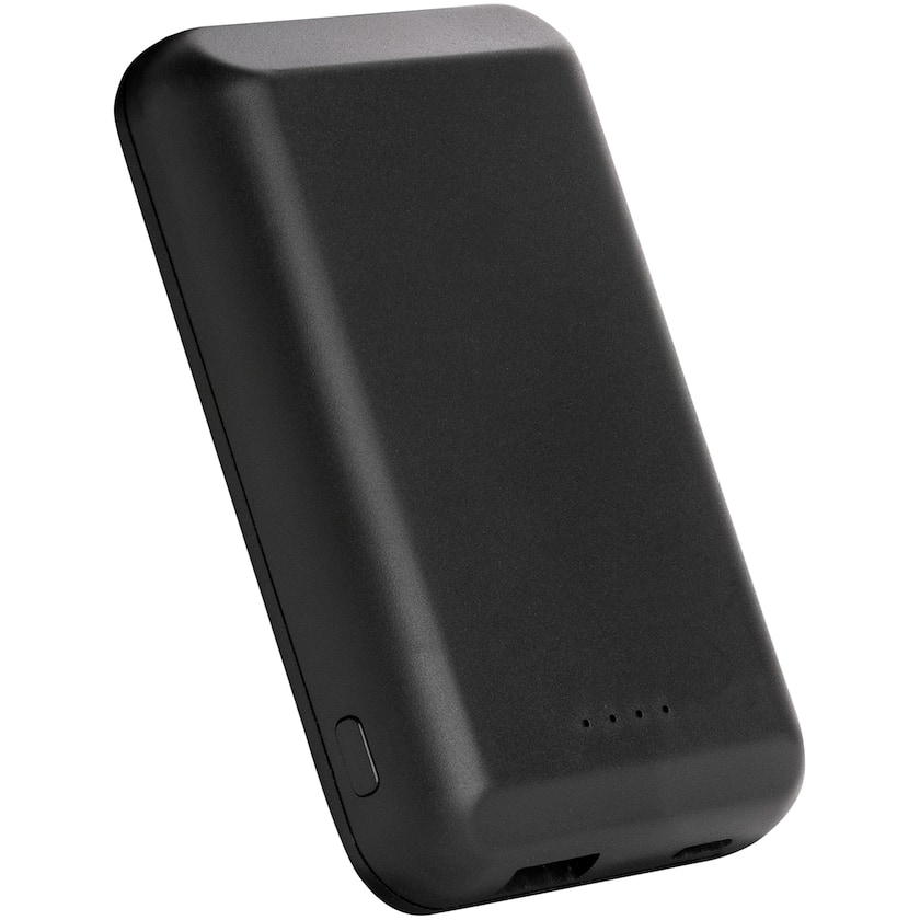 Batterie externe sans fil avec aimant pour le fixer à son mobile. Le dispositif de recharge sans fil est compatible avec tous les appareils QI (c'est-à-dire les iPhone 8 et ultérieurs, et les téléphones Android). Les autres téléphones portables peuvent être rechargés à l'aide du câble. Input USB-C 5V/2A. Output USB 5V/2A. Output sans fil 5V/1A 5W.
