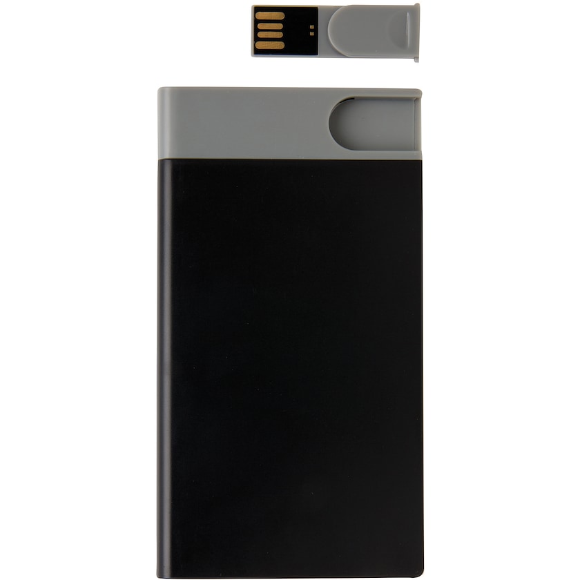 Chargeur adaptatif fin avec clé USB amovible. La clé USB possède une capacité de 8 GB. Câble USB inclus. Output 1V/1A et input 5V/1A. Une batterie externe fonctionnelle avec une grande surface d'impression!