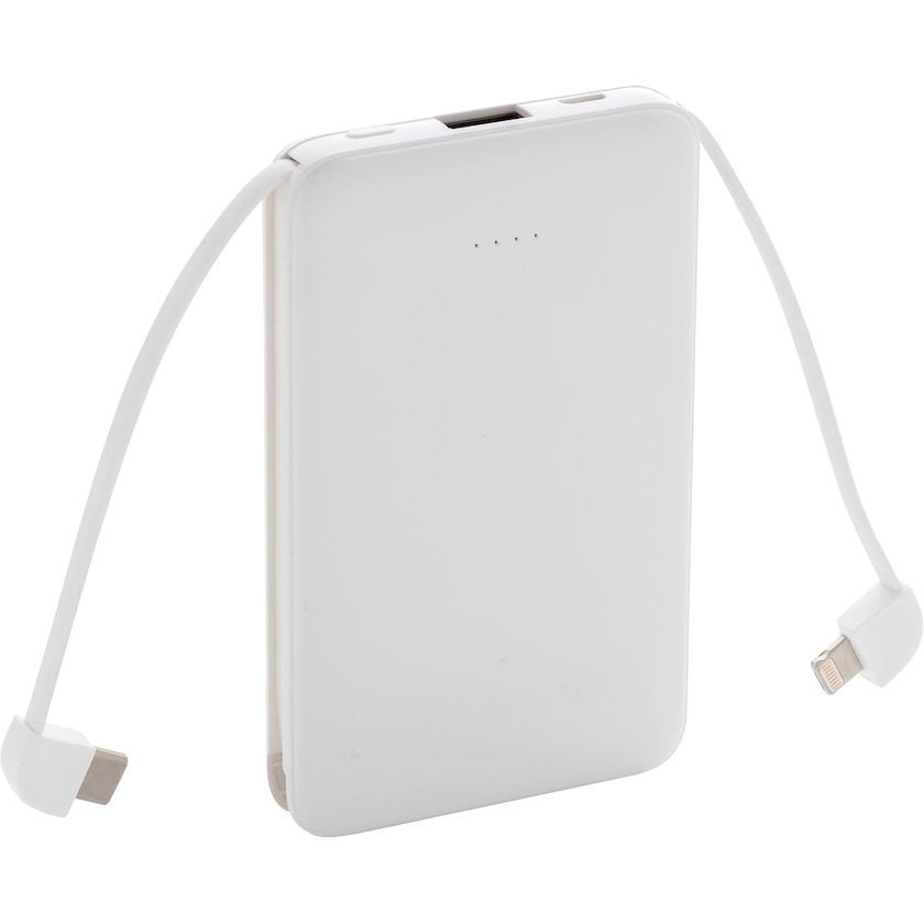 Chargeur portatif compact avec câbles intégrés. Peut recharger votre smartphone jusqu'à deux fois. Un voyant indique lorsqu'il est temps de le recharger. input: 5V/2A. Output: 5V/2A.