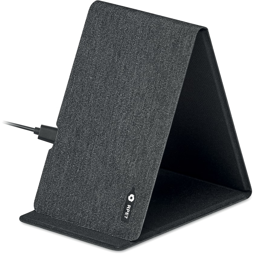 Chargeur sans fil pliable en matériau écologique. Le Folcroft est fabriqué en rPET, c'est-à-dire en bouteilles PET recyclées. Le chargeur est compatible avec tous les mobiles de dernière génération.