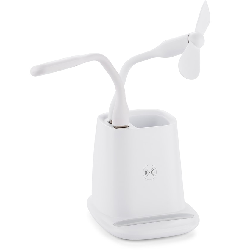 Chargeur sans fil combiné avec un pot à crayons, une lampe et un ventilateur. Quand le chargeur n'est pas utilisé, ses ports USB peuvent également servir de hub. Livré dans une boîte cadeau blanche.