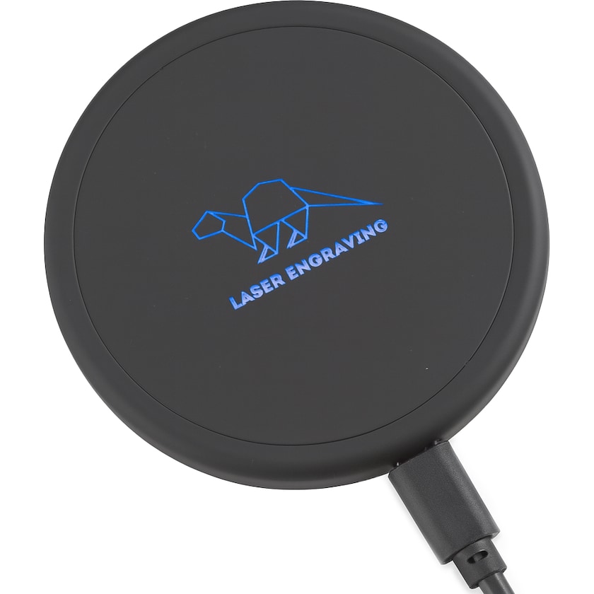 Chargeur sans fil où votre logo apparaître rétro-éclairé. Lorsque le chargeur est actif, la gravure laser luit en rouge, bleu ou blanc. Choisissez la couleur qui convient à votre entreprise. Livré dans une boîte cadeau noire. Compatible avec le standard Qi.