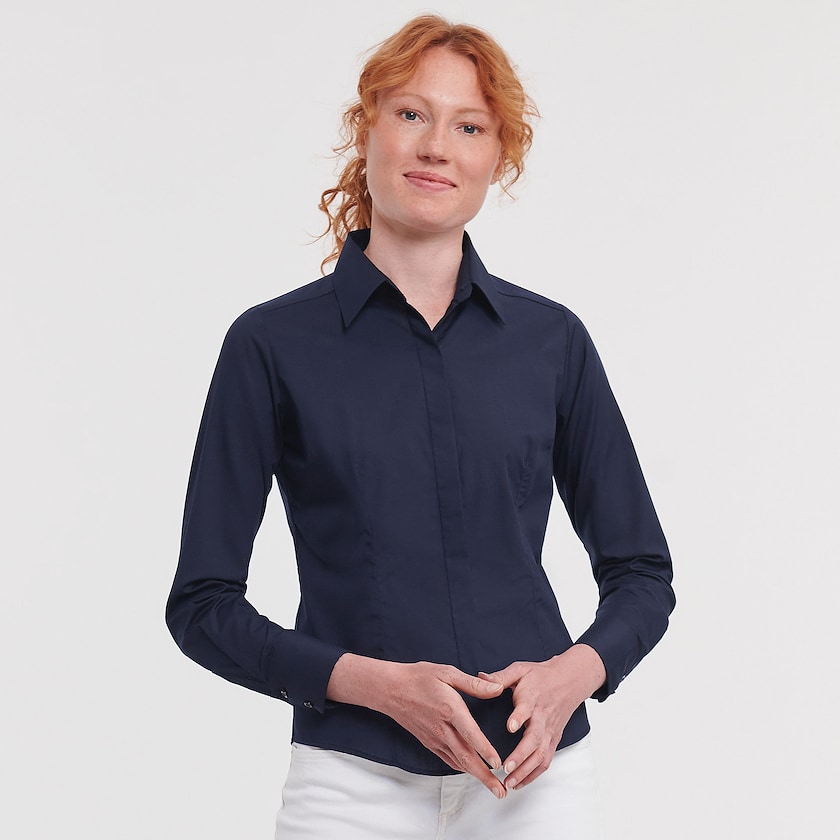 Chemise femme à manches longues en tissu de type easy care. La chemise possède une coupe moulante pour un style moderne. Les boutons sont cachés. Livrée sous emballage plastique individuel. Également disponible en version version homme.