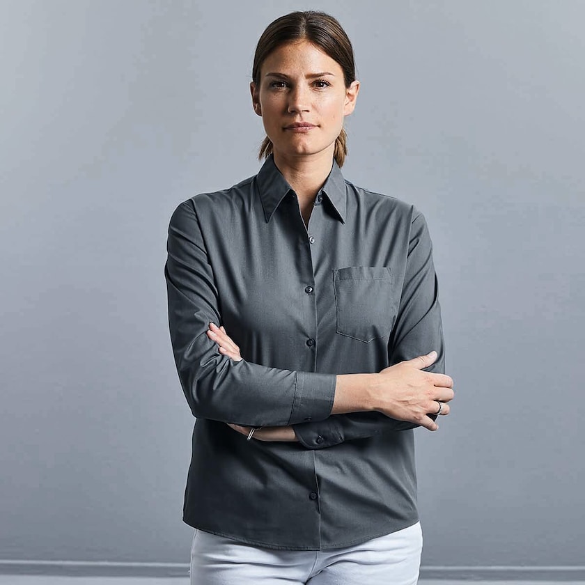 Chemise femme à manches longues en mélange de polyester résistant pour utilisation intensive. Livrée sous emballage plastique individuel.