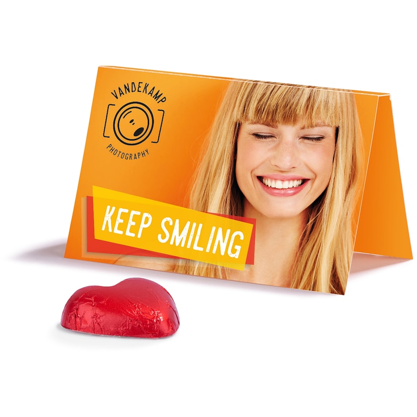 De la publicité qui a du cœur ! Carte avec un cœur en chocolat emballé dans un papier d'aluminium rouge. Les deux côtés de la carte est personnalisé entièrement suivant vos souhaits. La carte est perforée d'un côté pour que l'un des côtés puisse être utilisé comme carte de visite ou coupon de réduction, par exemple.