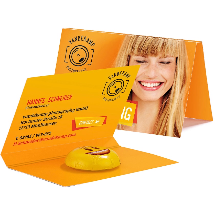 Carte avec un Lindt Hello Mini Emoticon à l'intérieur. Vous choisissez vous-même le personnage souhaité. Toute la carte est imprimée en quatre couleurs suivant vos souhaits.