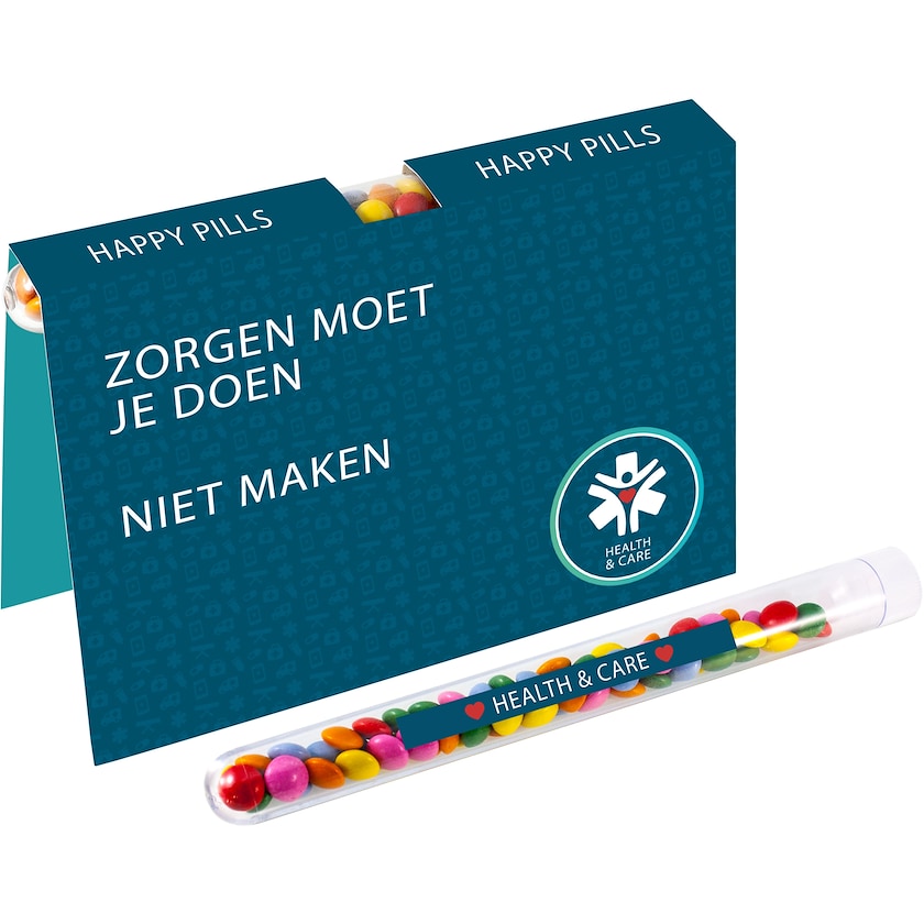 Tube à essai rempli de lentilles en chocolat inséré dans une carte. Le prix de la personnalisation fait référence à une impression photo par quadrichromie sur le tube et à essai et sur l'intégralité de la face avant et arrière de la carte.