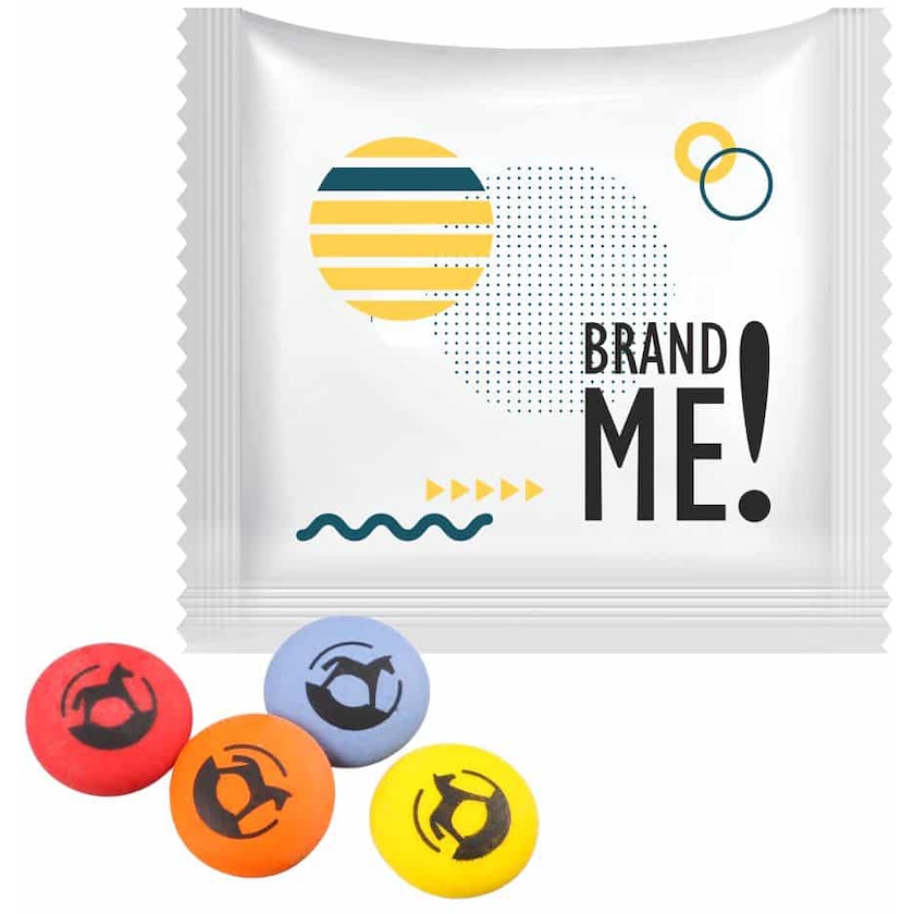 Dragées au chocolat avec personnalisation sur le sachet et les dragées. Le sachet est fabriqué en matériau biodégradable, et contient 5 délicieuses dragées au chocolat. Le sachet est personnalisé par impression photo en quadrichromie. L'impression en noir ou blanc sur l'avant et l'arrière des dragées est incluse dans le prix de l'impression. Le meilleur des bonbons publicitaires !