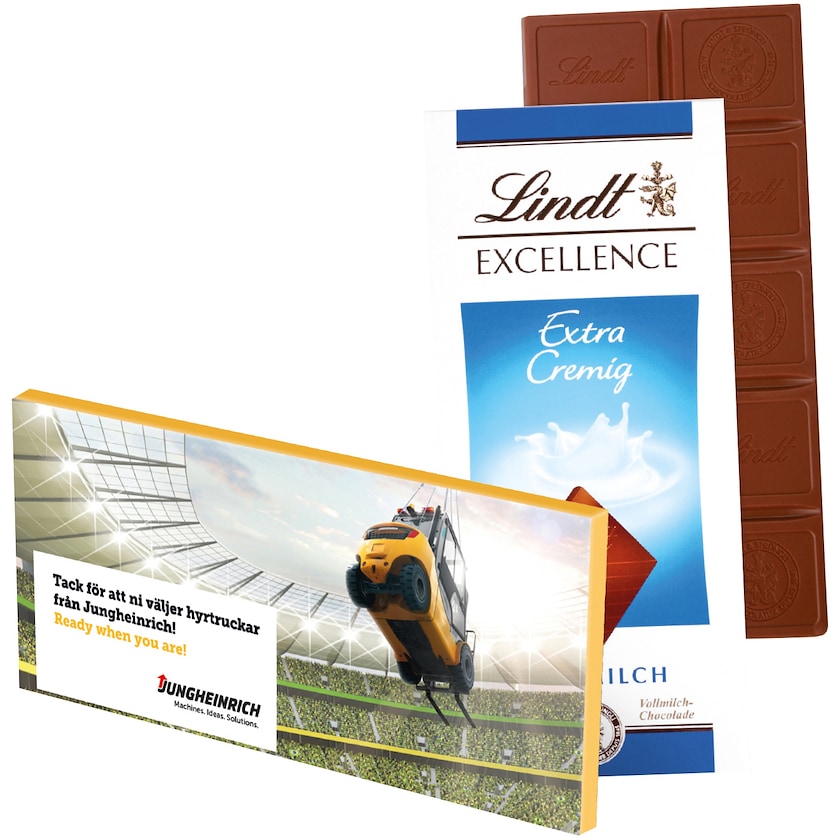 Tablette de chocolat Lindt Excellence de 100 g avec emballage en papier marqué par impression 4 couleurs. Choisissez parmi quatre goûts différents. Le chocolat se trouve dans une emballage d'origine et autour de celui se trouve l'emballage en papier imprimé en 4 couleurs.
