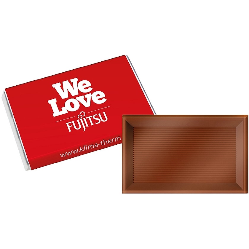 Rectangle de chocolat contenant le plus fin des chocolats belges. Le papier d'emballage est personnalisé par impression digitale. La quantité minimum de commande est de seulement 500 unités. Choisissez la couleur du papier d'aluminium parmi les coloris suivants: argent, or, rouge, bleu et noir.