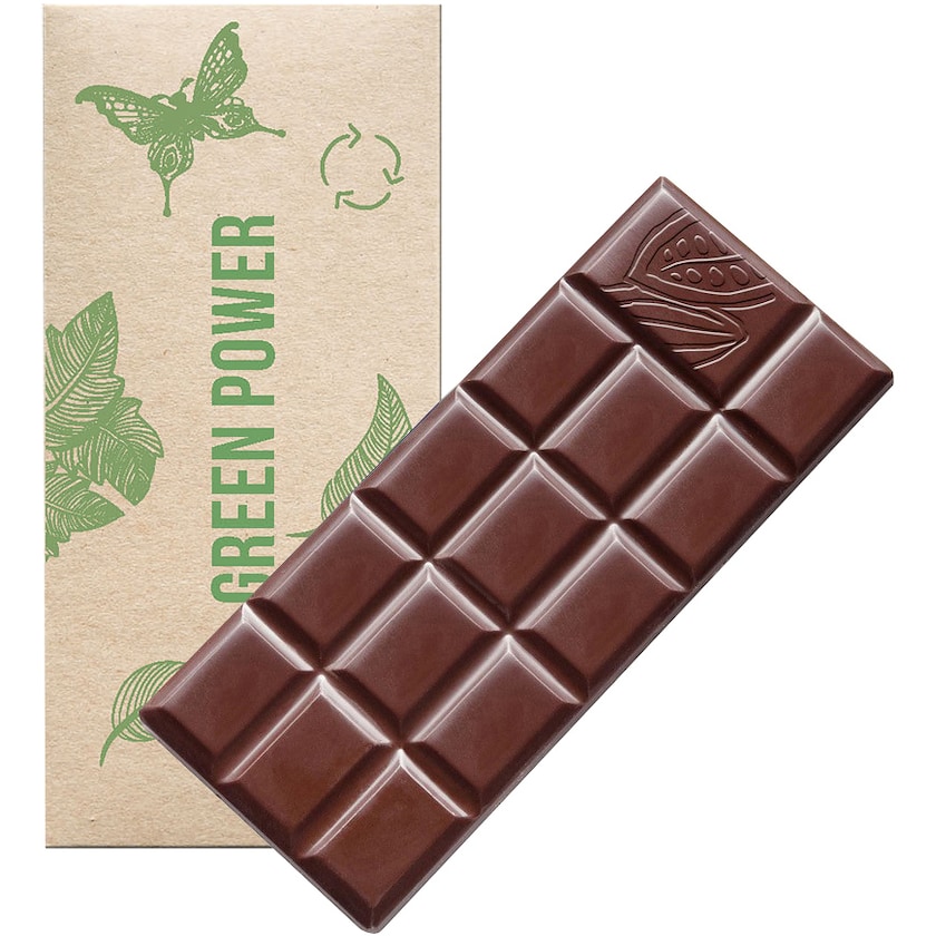 Tablette de 50 g de chocolat de la plus haute qualité avec emballage en papier recyclé. L'emballage est personnalisé par impression digitale CMJN. L'emballage peut même être imprimé en offset suivant les tons Pantone (voir article 17235). Le chocolat est de la plus haute qualité et est emballé sous vide pour une hygiène alimentaire maximum.
