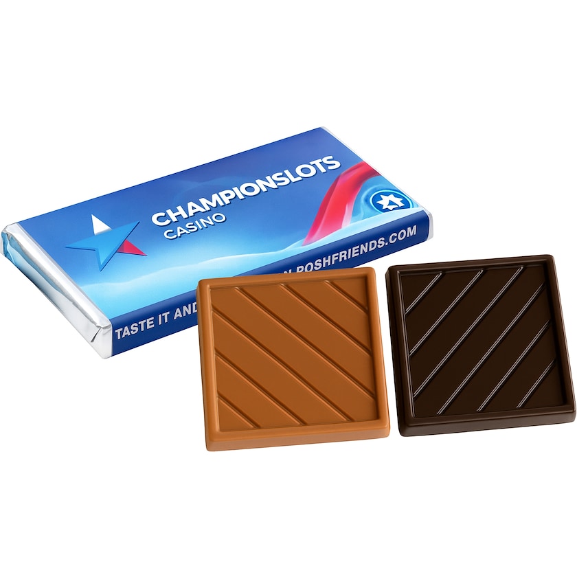 Deux carrés de chocolat dans un seul paquet. Les carrés de chocolat sont disponibles dans les saveurs chocolat au lait 32 % et chocolat noir 70 %. Choisissez une des saveurs ou une de chaque saveur. Vous pouvez également choisir si vous souhaitez une feuille d’argent ou d’or.