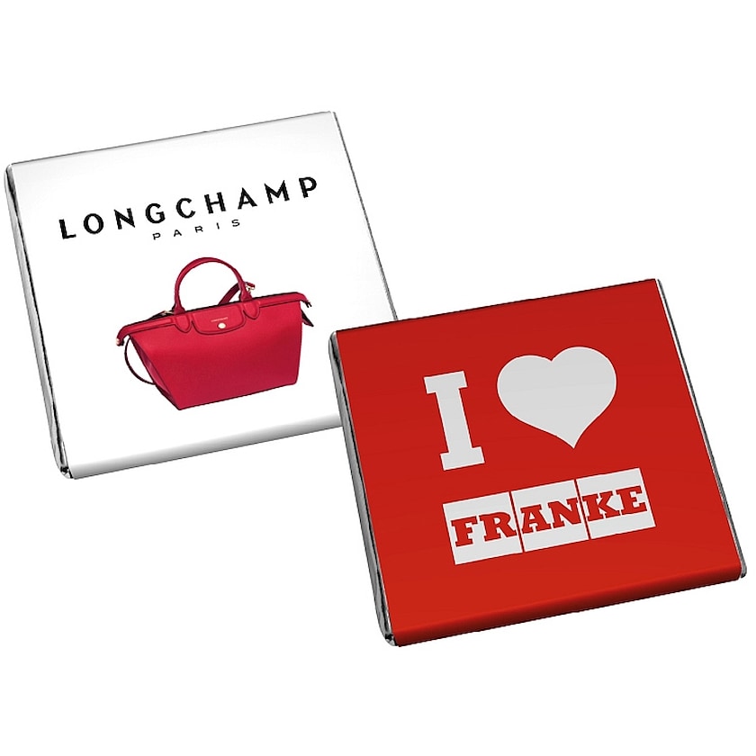 Carré de chocolat de 5 grammes pouvant être commandé à partir de seulement 2000 unités. Le chocolat est de la plus haute qualité et est disponible en chocolat blanc, chocolat noir et chocolat au lait. L'emballage peut être commandé en argenté, doré, noir, bleu ou rouge. La personnalisation est effectuée par impression en quadrichromie.