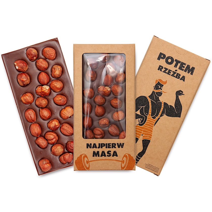 Gâteau au chocolat à base de chocolat au lait belge et de noisettes entières. Le chocolat au lait contient 44 % de cacao et est merveilleusement onctueux. L'emballage en carton possède une fenêtre et est entièrement imprimé selon vos souhaits.
