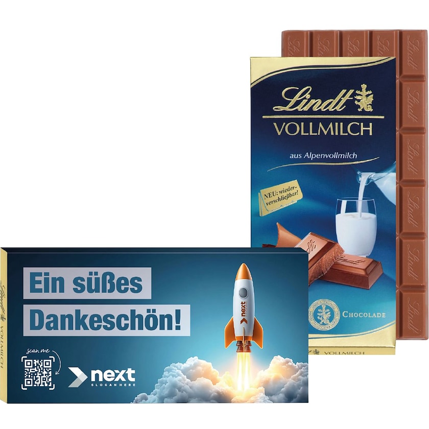 Gâteau au chocolat luxueux de Lind avec du chocolat au lait. Une pochette en carton avec votre impression est placée autour de la barre chocolatée.