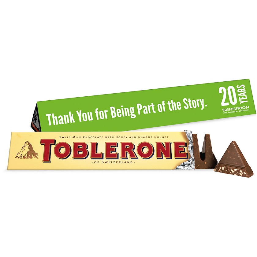 Tablette de chocolat de 100 grammes par le fabricant suisse Toblerone. Choisissez parmi trois goûts différents. La tablette est placée dans un étui en carton avec votre imprimé.