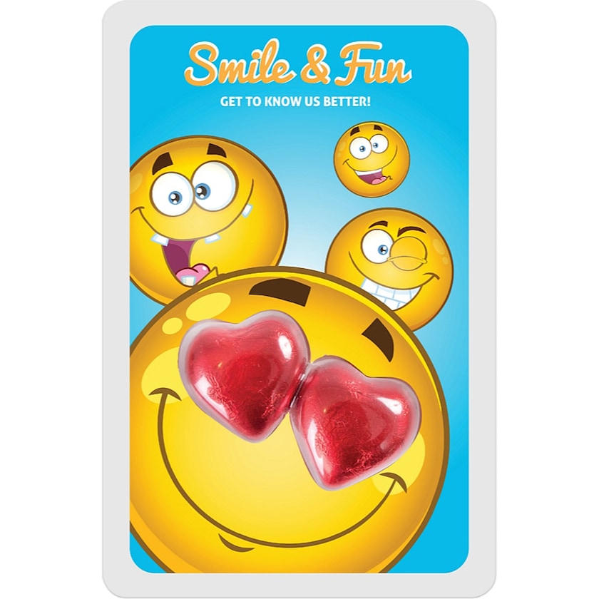 Carte imprimée en 4 couleurs avec 2 cœurs en chocolat sous blister. Les cœurs en chocolat sont fabriqués dans un délicieux chocolat au lait et pèsent 10 grammes en tout. Choisissez entre un papier d'aluminium rouge, argenté ou doré.