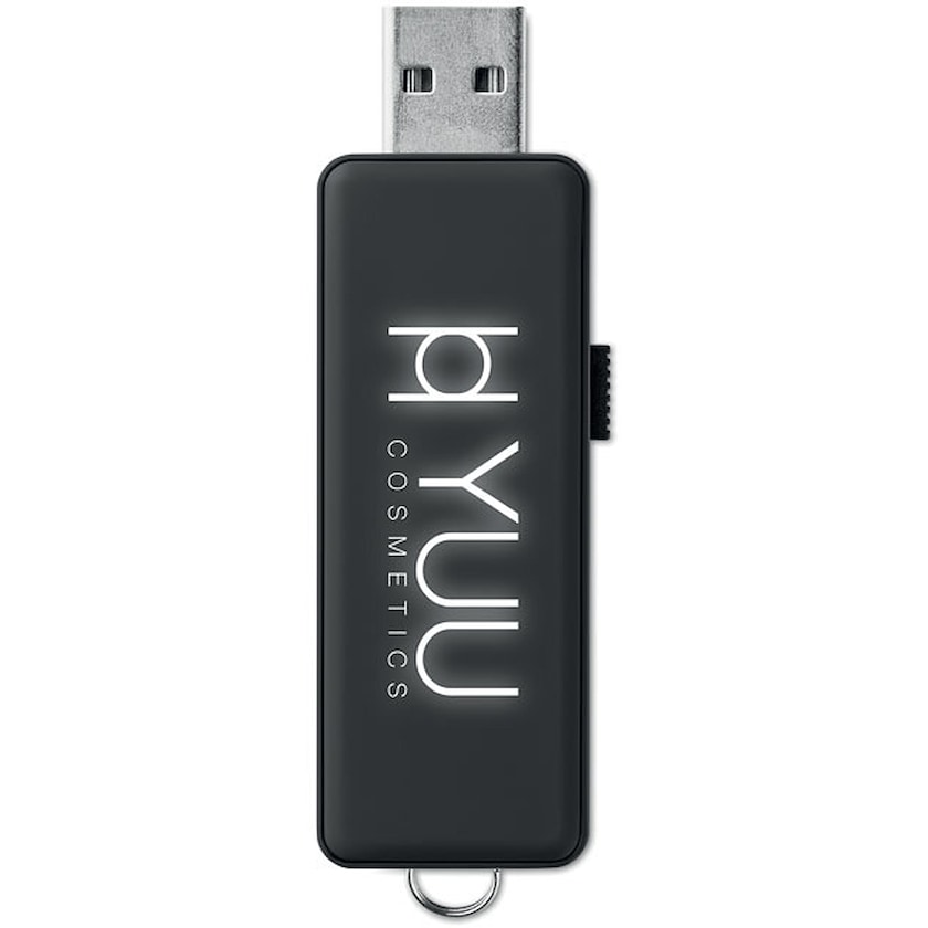 Clé USB avec votre logo. Votre logo est gravé au laser sur la clé USB et lorsqu'elle est utilisée, elle s'illumine. Vous pouvez choisir entre une lumière rouge, bleue, verte, jaune ou blanche. Illuminez votre marque !