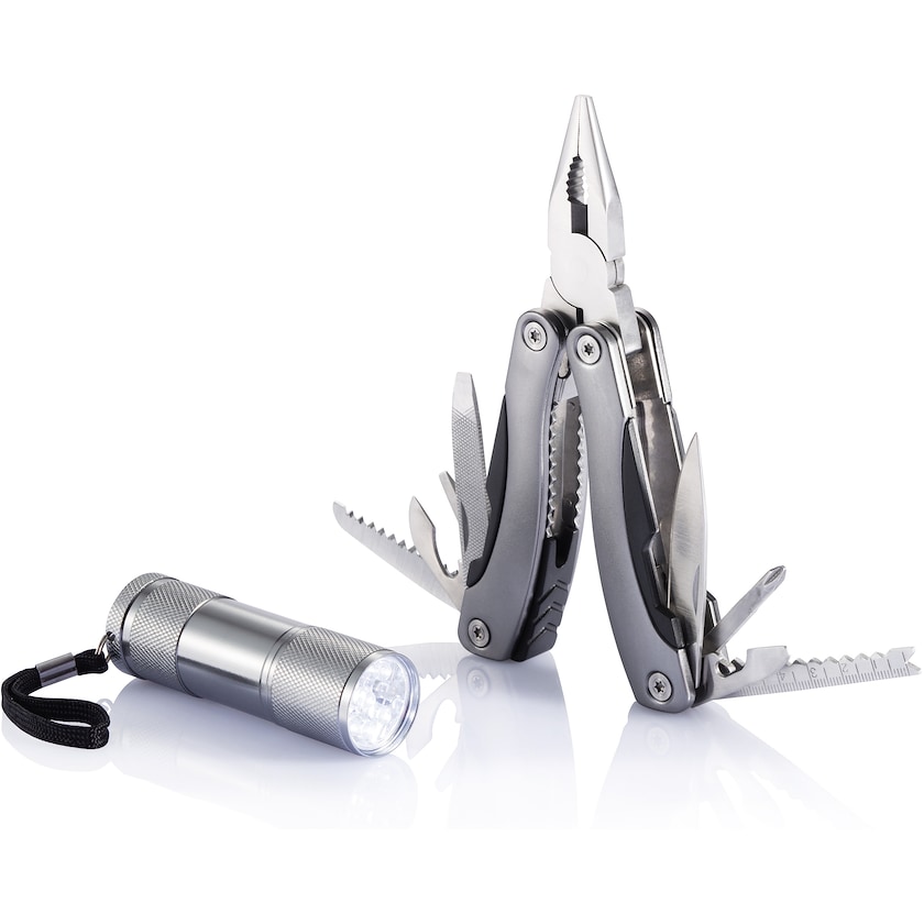 Kit pratique avec outil multifonctions Baumgarten et lampe de poche LED. Cet outil multifonctions possède 14 fonctions et la lampe de poche 9 LEDs. L'ensemble est livré dans une boîte cadeau noire en papier. Le prix de l'impression ou de la gravure est indiqué pour la personnalisation d'un produit.