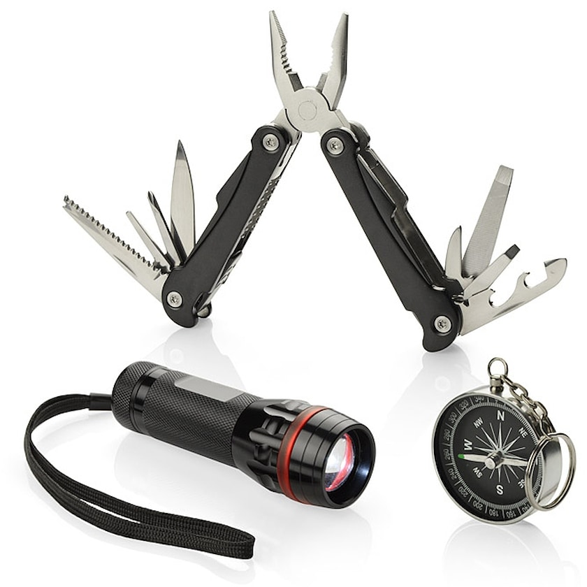 Kit cadeau haut de gamme contenant outils multifonctions, boussole et lampe de poche. Kit cadeau haut de gamme contenant lampe de poche et outil multifonctions. La lampe de poche possède une diode très puissante, une lumière ajustable et une fonction de zoom ainsi que trois statuts d'éclairage: puissant, faible, et clignotant. La lampe de poche et l'outil multifonctions sont fabriqués en métal et livrés dans une élégante boîte cadeau noire. Le marquage est effectué par gravure laser, à une taille maximum de 80 x 20 mm sur la lampe de poche et de 60 x 7 mm sur l'outil multifonction.