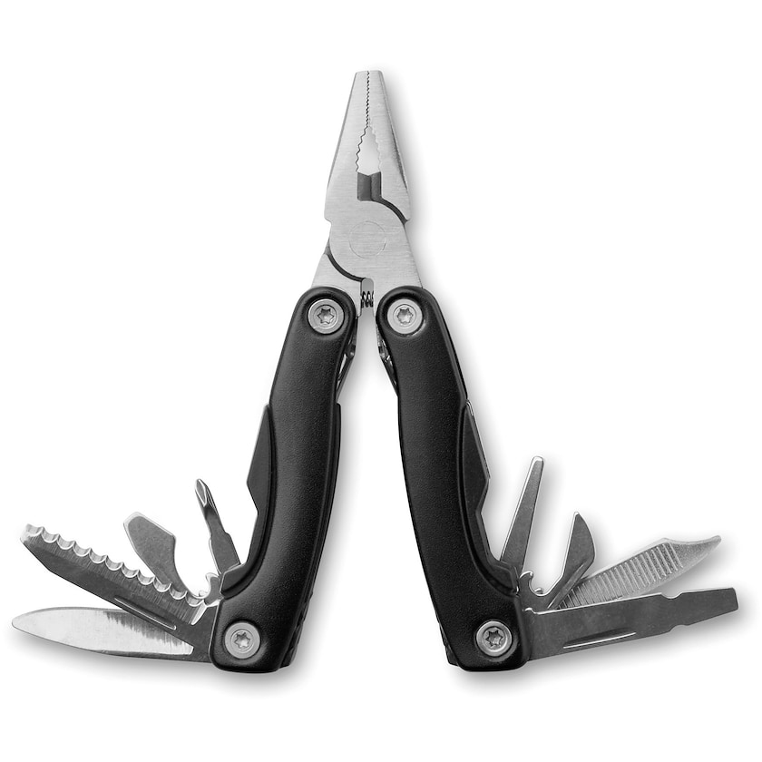 Outil multifonction en acier inoxydable. L'outil compte 9 fonctions différentes. La personnalisation est réalisée soit par impression monochrome, soit par gravure laser.