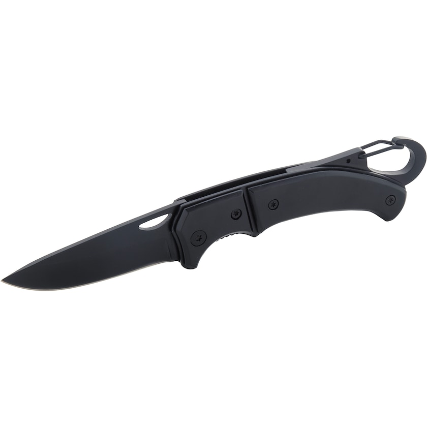Couteau de poche entièrement noir avec verrou de sécurité et mousqueton. La lame est en acier inoxydable et le manche est en aluminium.