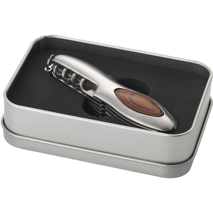 Couteau de poche exclusif avec 15 fonctions. Le Rodney est fabriqué en métal avec inserts en bois. Livré dans une boîte en métal. La personnalisation peut être effectuée soit sur le couteau soit sur la boîte en métal.