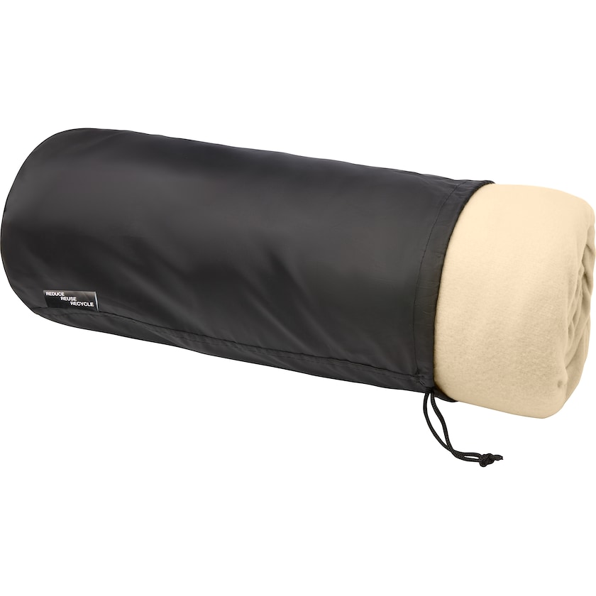 Plaid personnalisé ultra doux en matériau écologique. Le plaid et son sac de rangement sont fabriqués en polyester recyclé. La personnalisation est réalisée sur le sac de rangement.