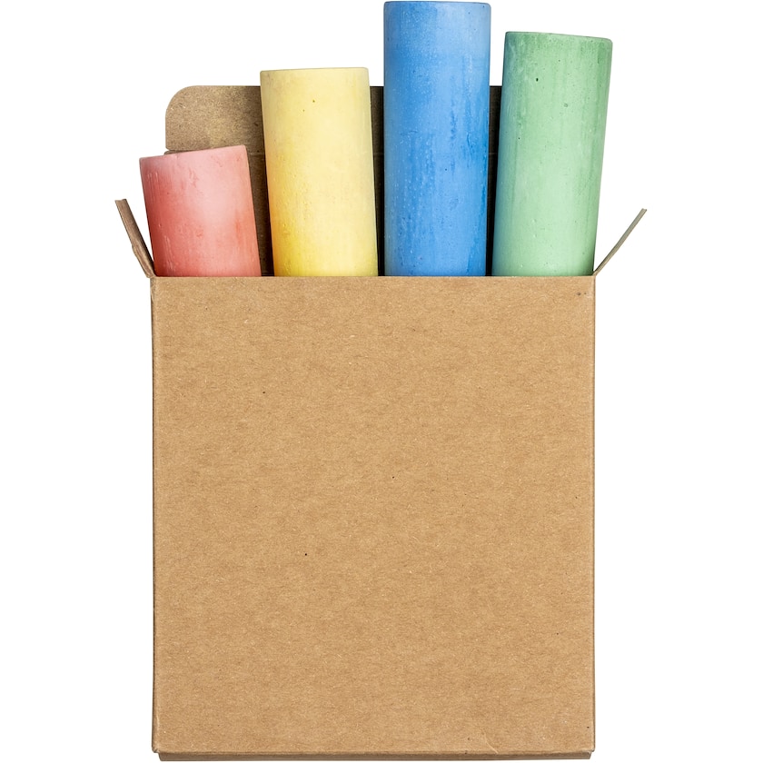 Quatre craies de rue dans une boîte en carton de couleur naturelle. Un cadeau amusant pour les enfants créatifs.