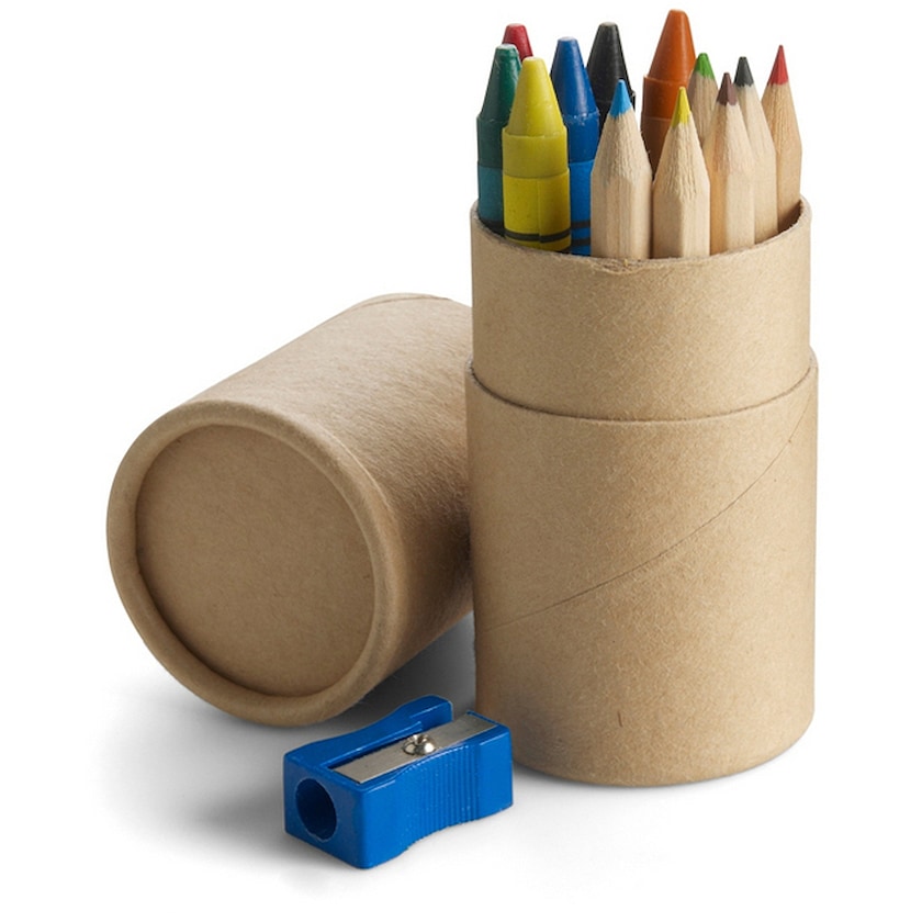 Tube en carton contenant 6 crayons de cire, 6 crayons de couleur et 1 taille-crayons. Un joli kit à dessin économique pour enfants créatifs.