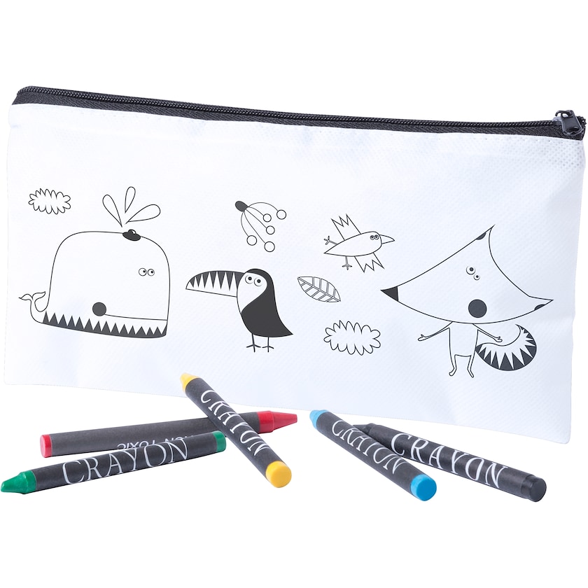 Set de dessin composé de craies et d'une trousse à crayons. La trousse à crayon possède un motif pré-imprimé qui peut être colorié.