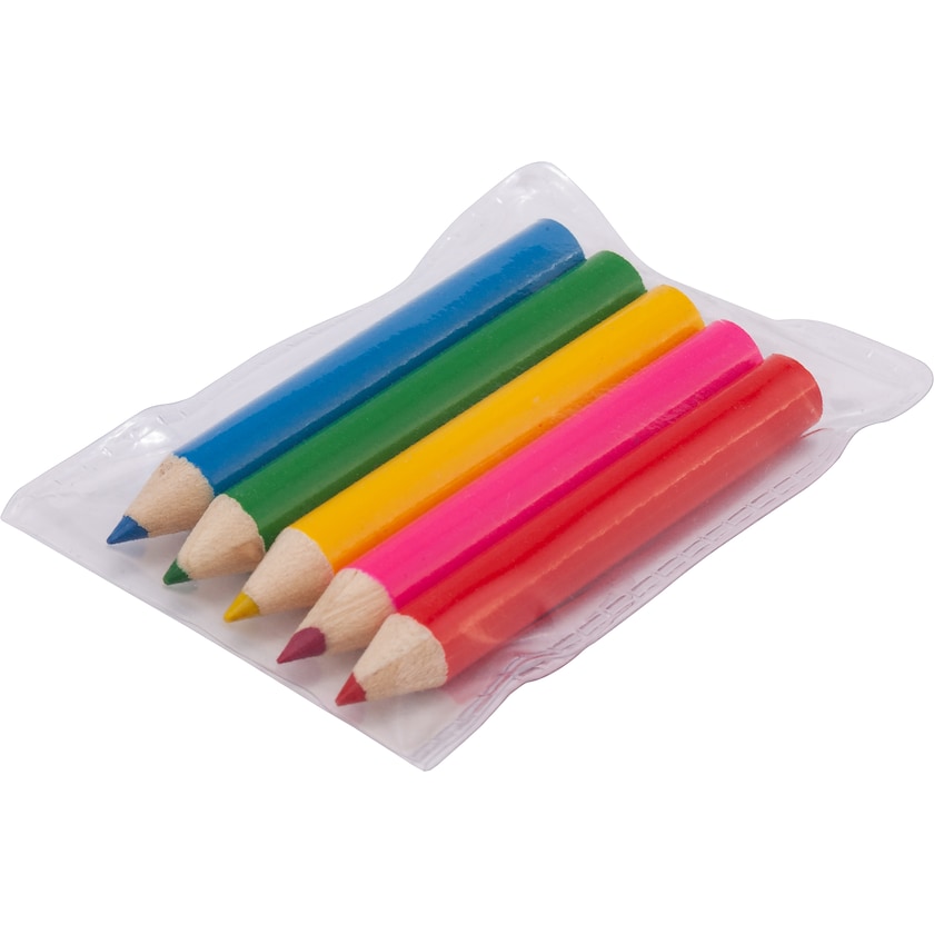 Petit set de 5 crayons de couleur. Les crayons de couleur sont livrés dans un étui de rangement transparent, personnalisé par impression digitale.