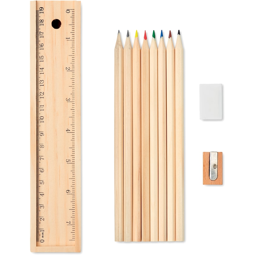 Set de crayons de couleur dans une boîte en bois. Le set comporte 2 crayons à papier, 6 crayons de couleur, 1 taille-crayon, 1 gomme et 1 règle. La règle sert également de couvercle à la boîte.