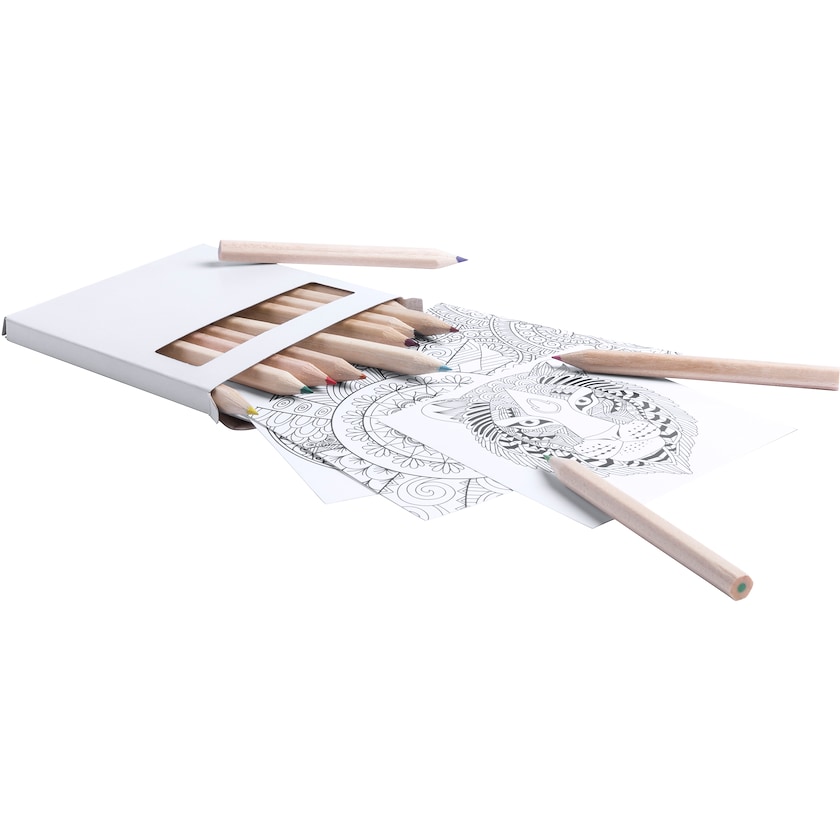 Set de 12 crayons de couleur et 12 feuilles ornées de mandalas. Un set qui apporte joie et détente aux jeunes comme aux vieux. Coloriez-le et sentez le calme vous envahir! L'impression est effectuée sur l'emballage et peut être réalisée en deux couleurs maximum.