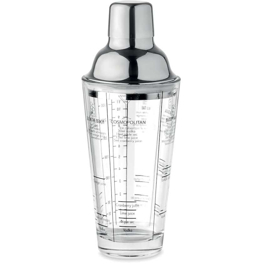 Shaker en verre avec couvercle en acier inoxydable. Les recettes et les mesures des cocktails sont imprimées sur le verre. Un cadeau idéal pour tous les amateurs de bonnes boissons.