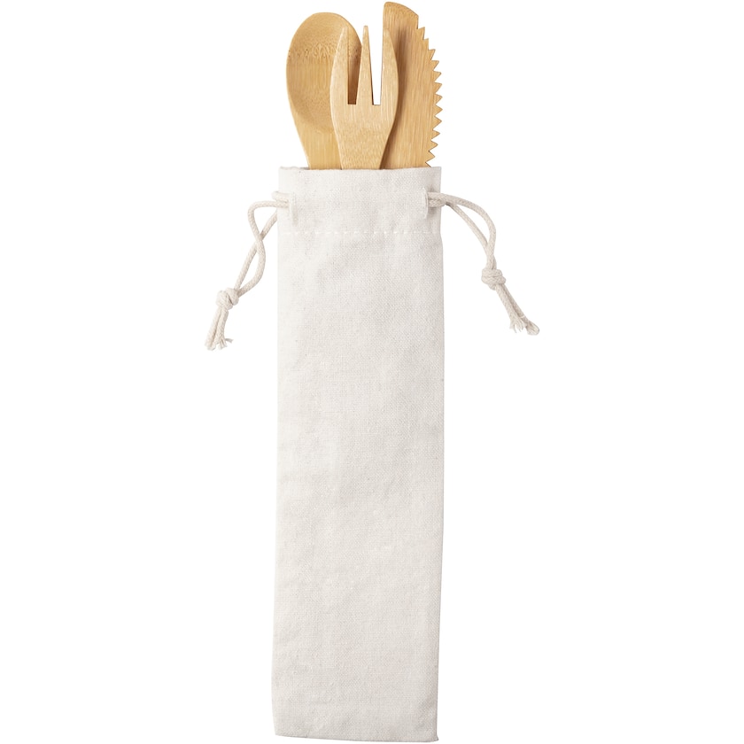 Set de couverts en bambou véritable. Le set est livré dans un sac en coton naturel. La personnalisation peut être réalisée soit par impression sur le sac ou par gravure laser sur l'un des couverts.