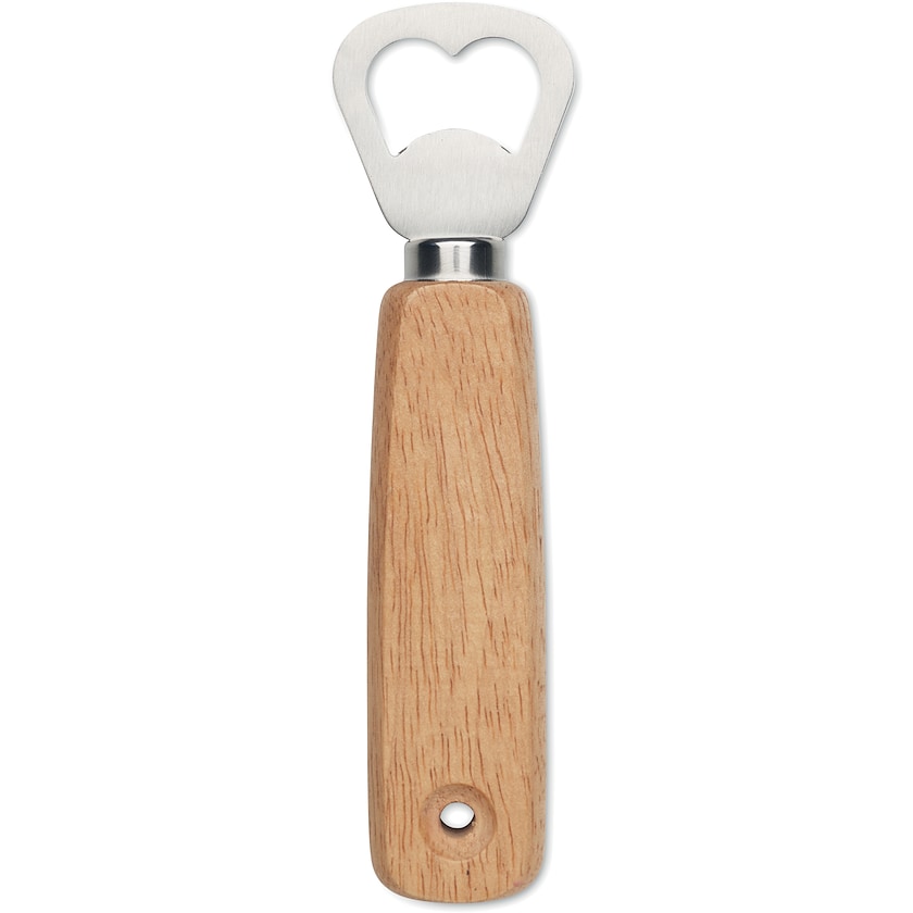 Décapsuleur avec manche en bois d'hévéa. Le marquage se fait soit par impression, soit par gravure laser.