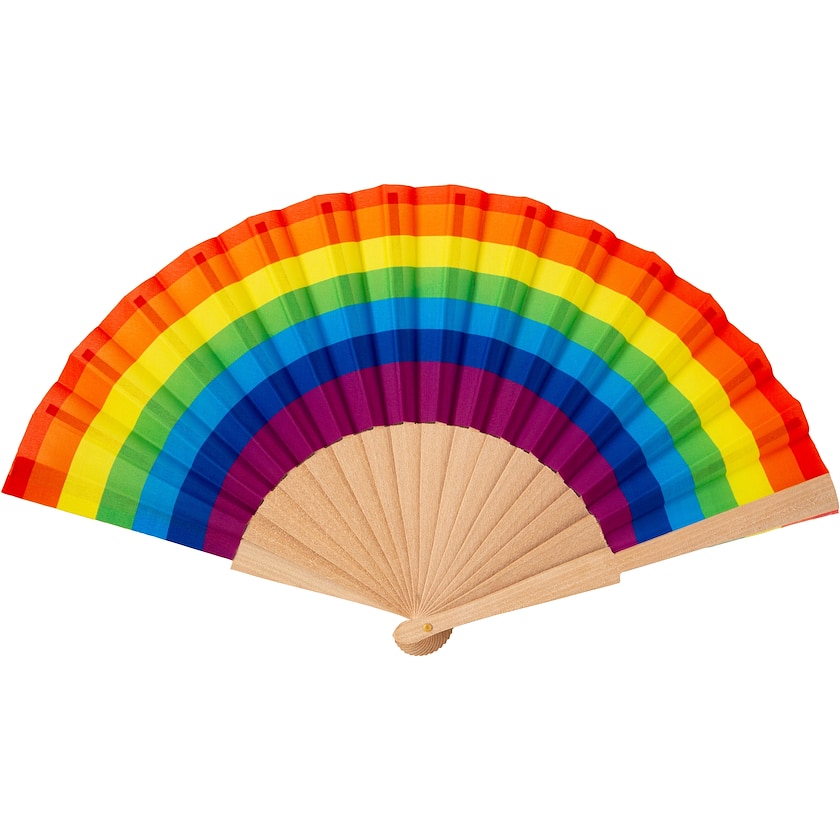 Eventail en tissu à motifs arc-en-ciel. Fabriqué en polyester et en bois.