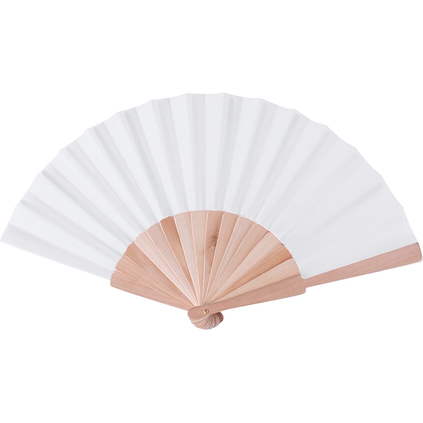 Éventail en bois et tissu en polyester et coton résistant. Le marquage se fait par impression ou gravure laser sur la nervure en bois.