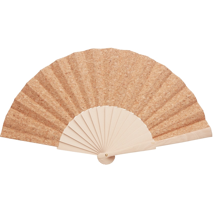 Éventail unique en bois et liège. Le matériau de l'éventail lui confère une apparence aussi belle que naturelle. L'impression ou la gravure laser sont réalisées sur la partie en bois de l'éventail.